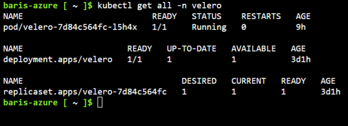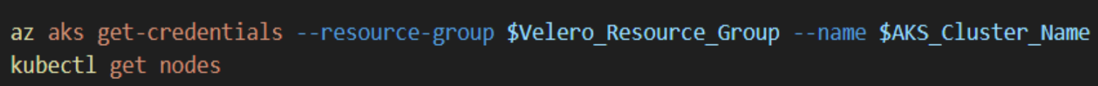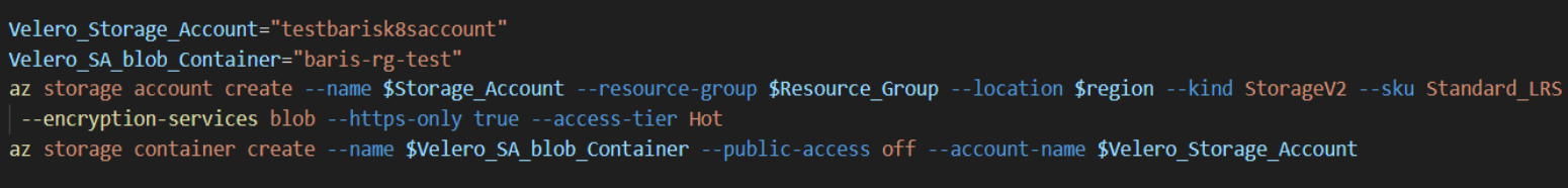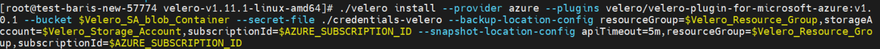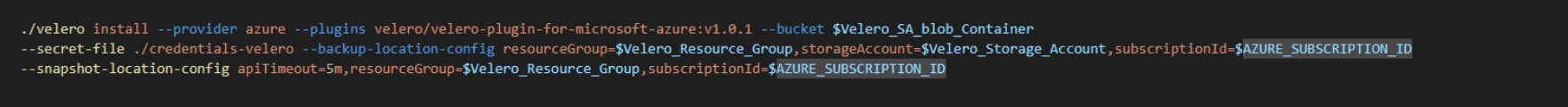 - Finally, install Velero on AKS. Check all the variables and values before starting Velero.