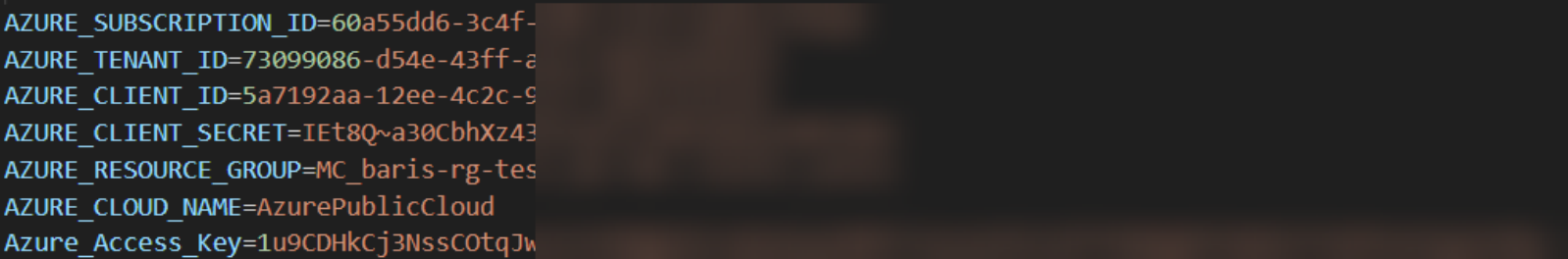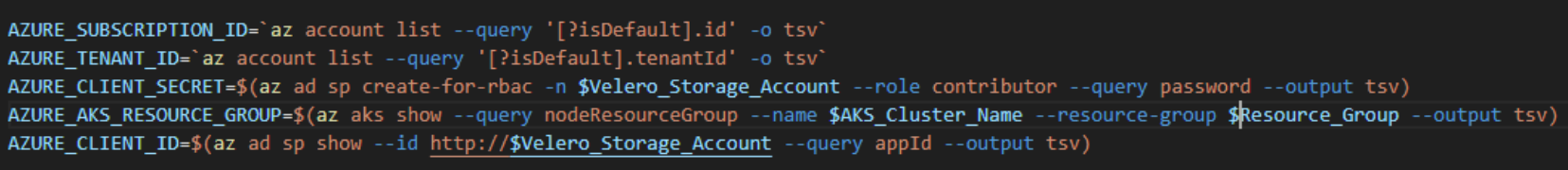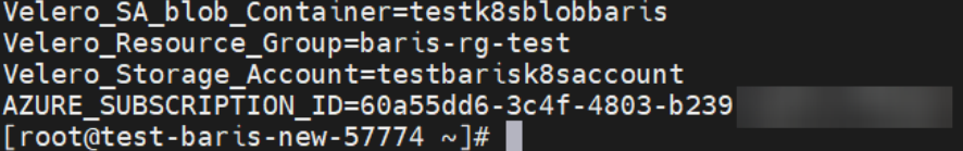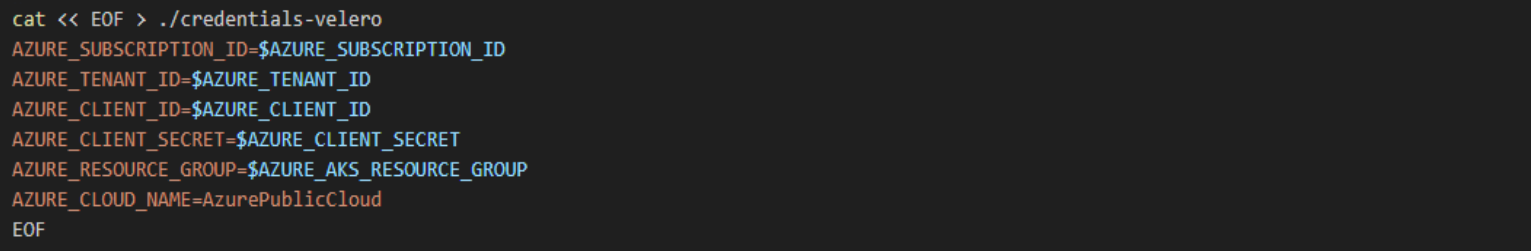 - At this point, the “credentials-velero” file needs to be populated with certain parameters, such as “Azure_Client_ID”, “Azure_Subscription_ID”, “Azure_Tenant_ID”, “Azure_Client_Secret” and “Azure_Resource_Group”. These settings can be obtained in step 5 above.