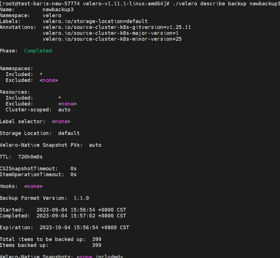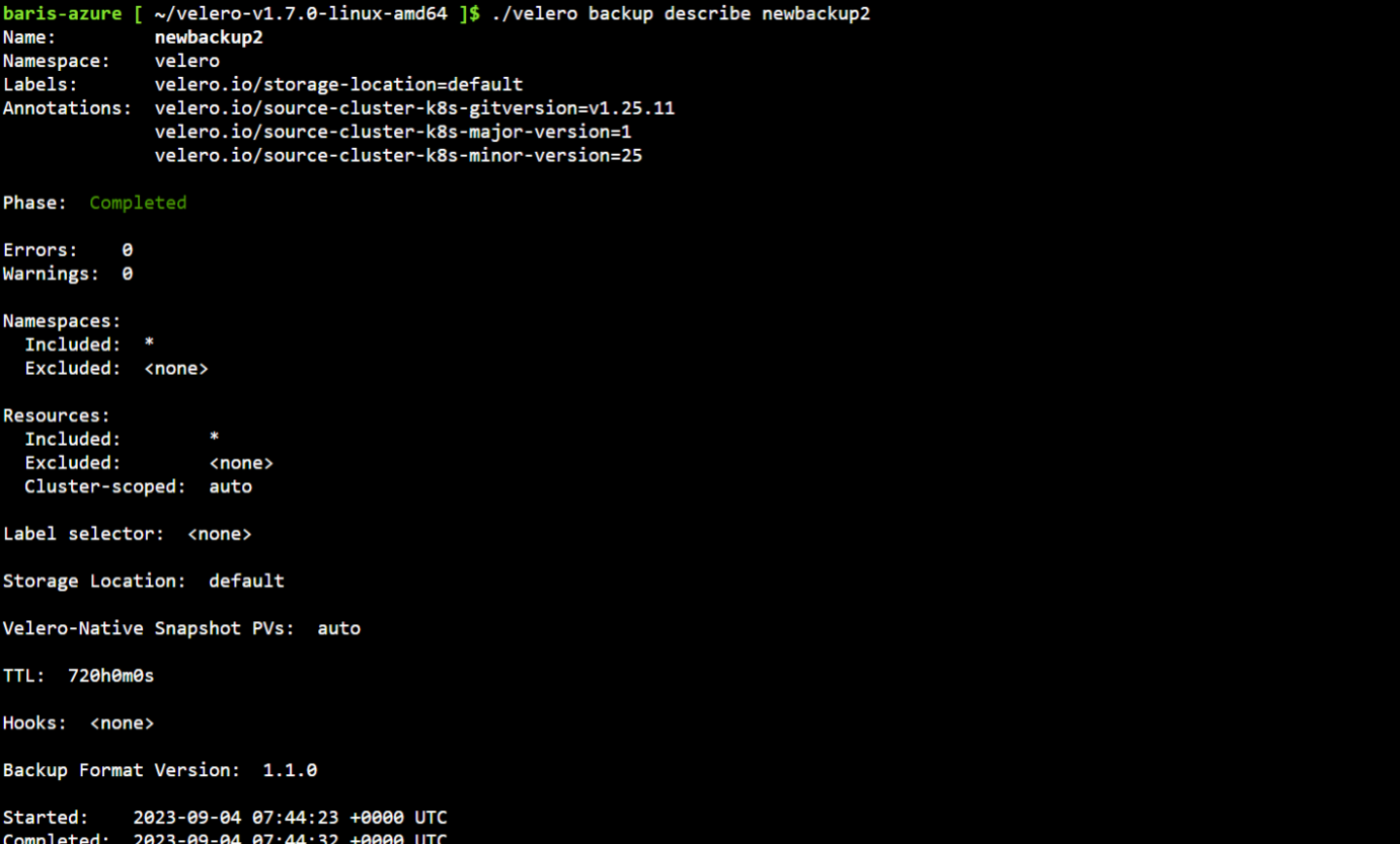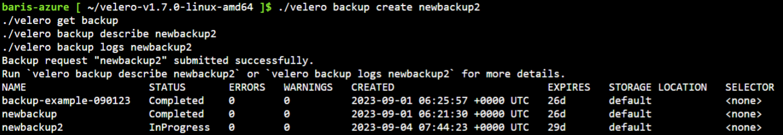 - Create a new backup using the command: “./velero backup create $Backup_Name” and wait a few minutes until the backup is completed.