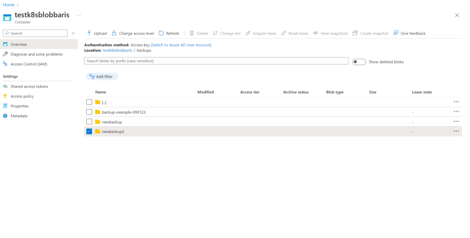 - Navigate to the storage accounts section and check if the data was successfully backed up. Navigate to Home > Storage Account > Containers.