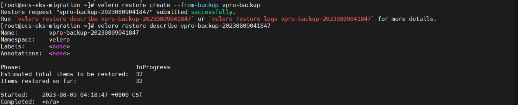 - Use the Velero tool to create a restore and specify a backup. In this example, the backup named vpro-backup will be used to restore a WordPress application to the CCE cluster.