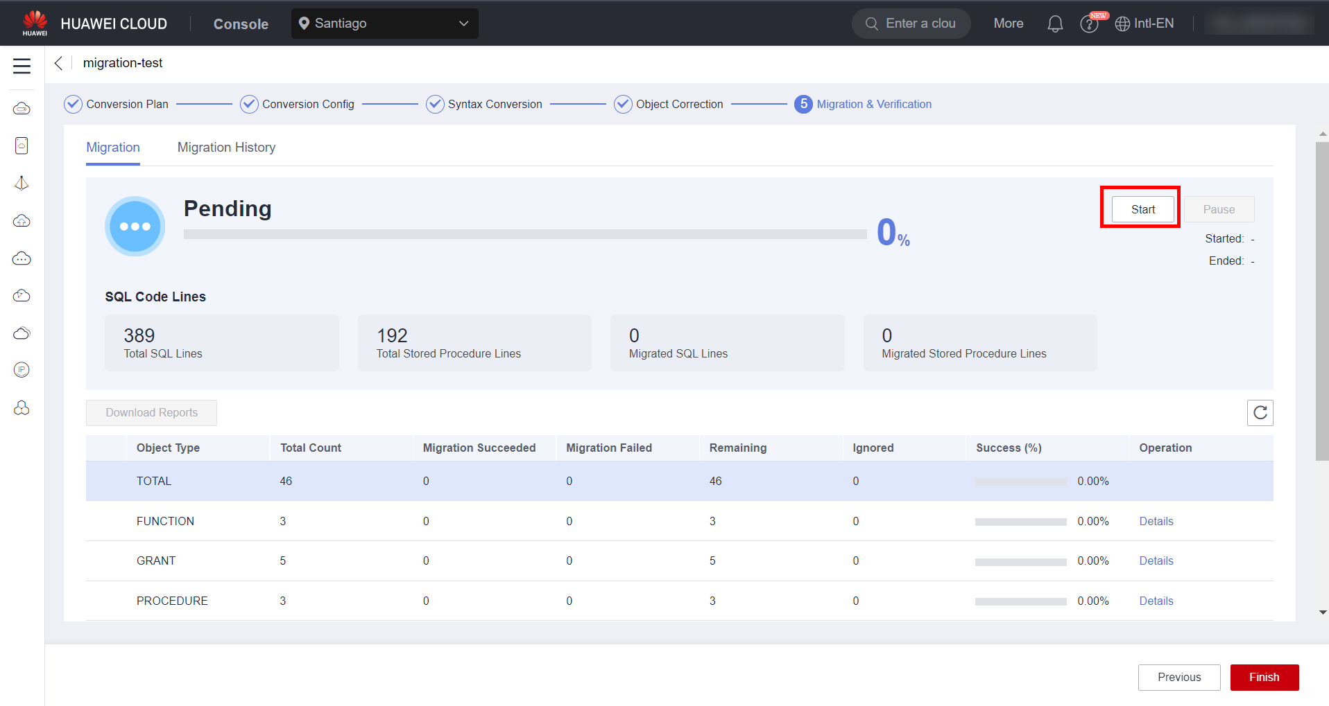 To start the syntax conversion process, click “Start” next to “Pending”. Wait until the syntax of all objects is converted to the syntax supported by the target database.