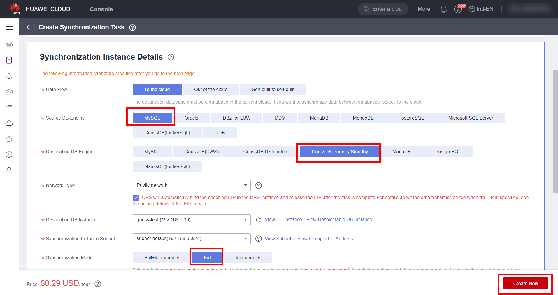 Navigate to the “Data Synchronization Management” subsection and click “Create Synchronization Task” to create a DRS task. Fill in the task fields as shown below: