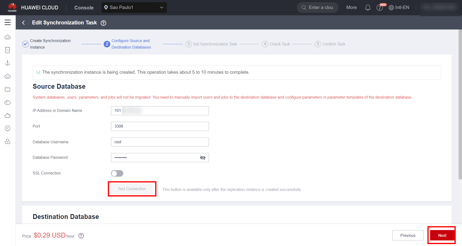 Wait until the synchronization instance is created, which may take a few minutes. After the instance is started, fill in the information related to the source database and the target database, such as username, password and public IP, and test the connection to both databases. After testing the connections, select the “Next” button to continue.