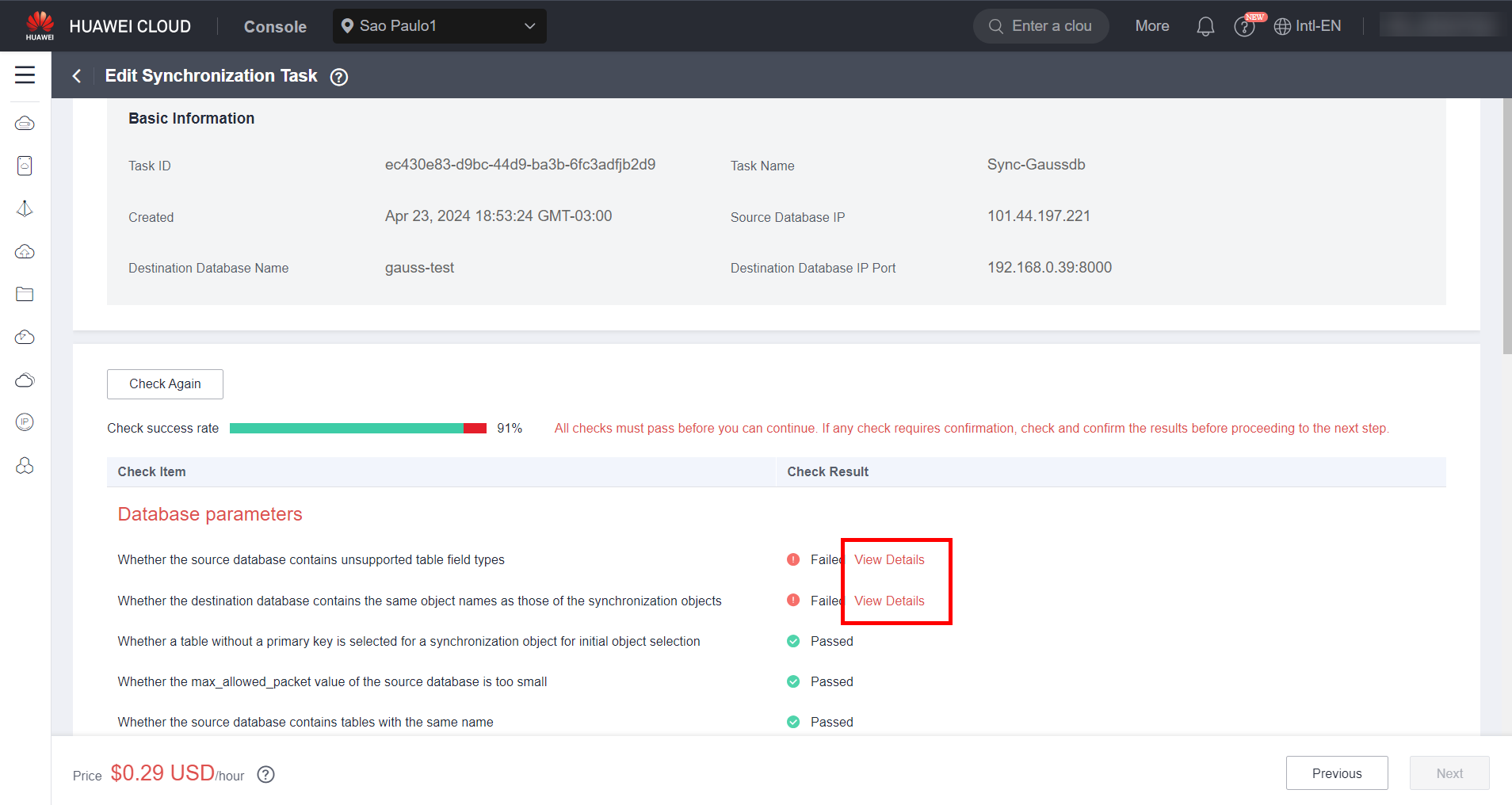 Wait for the synchronization pre-check to complete. If any of the parameters fails to sync, please confirm the reason for the failure