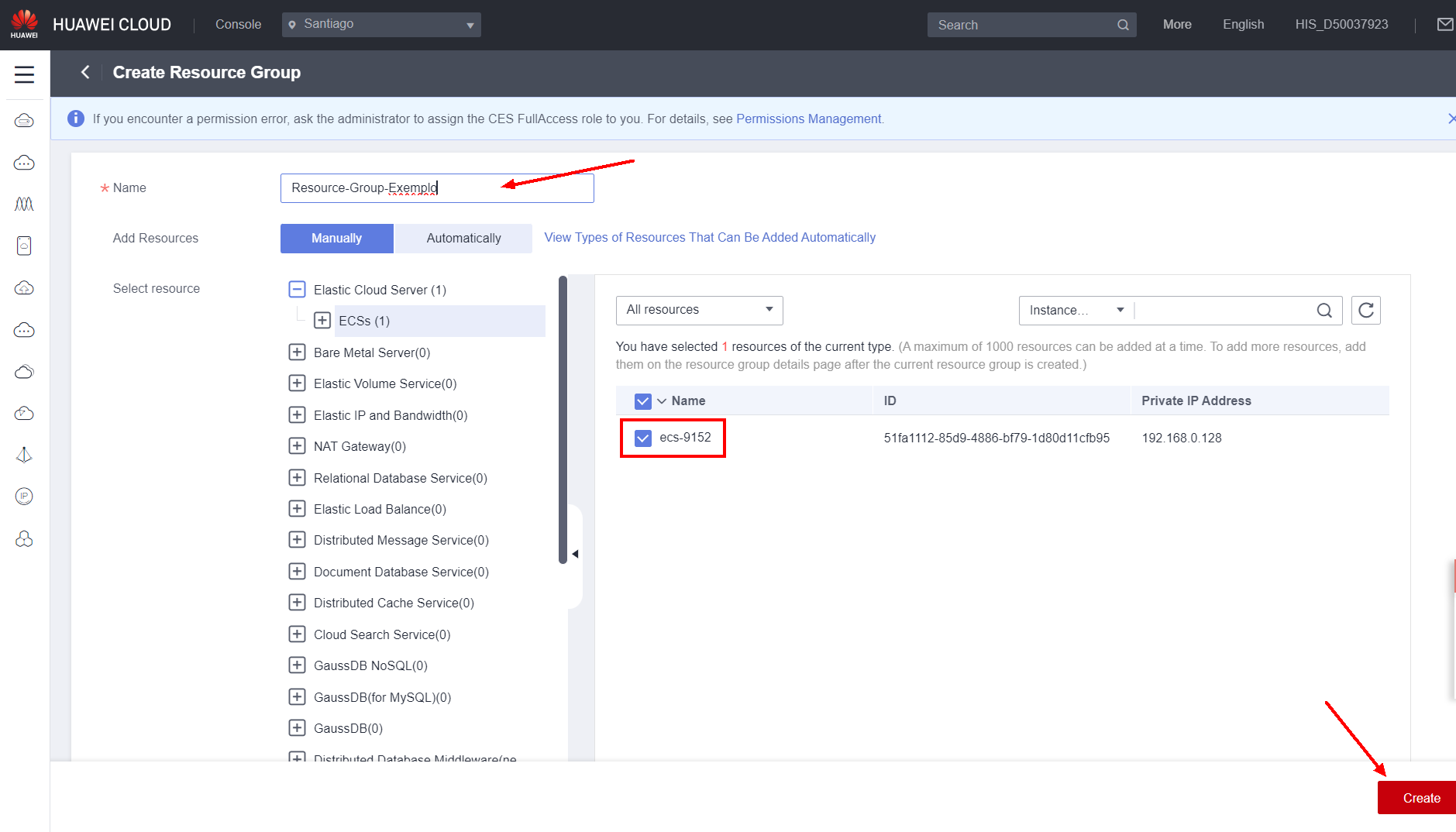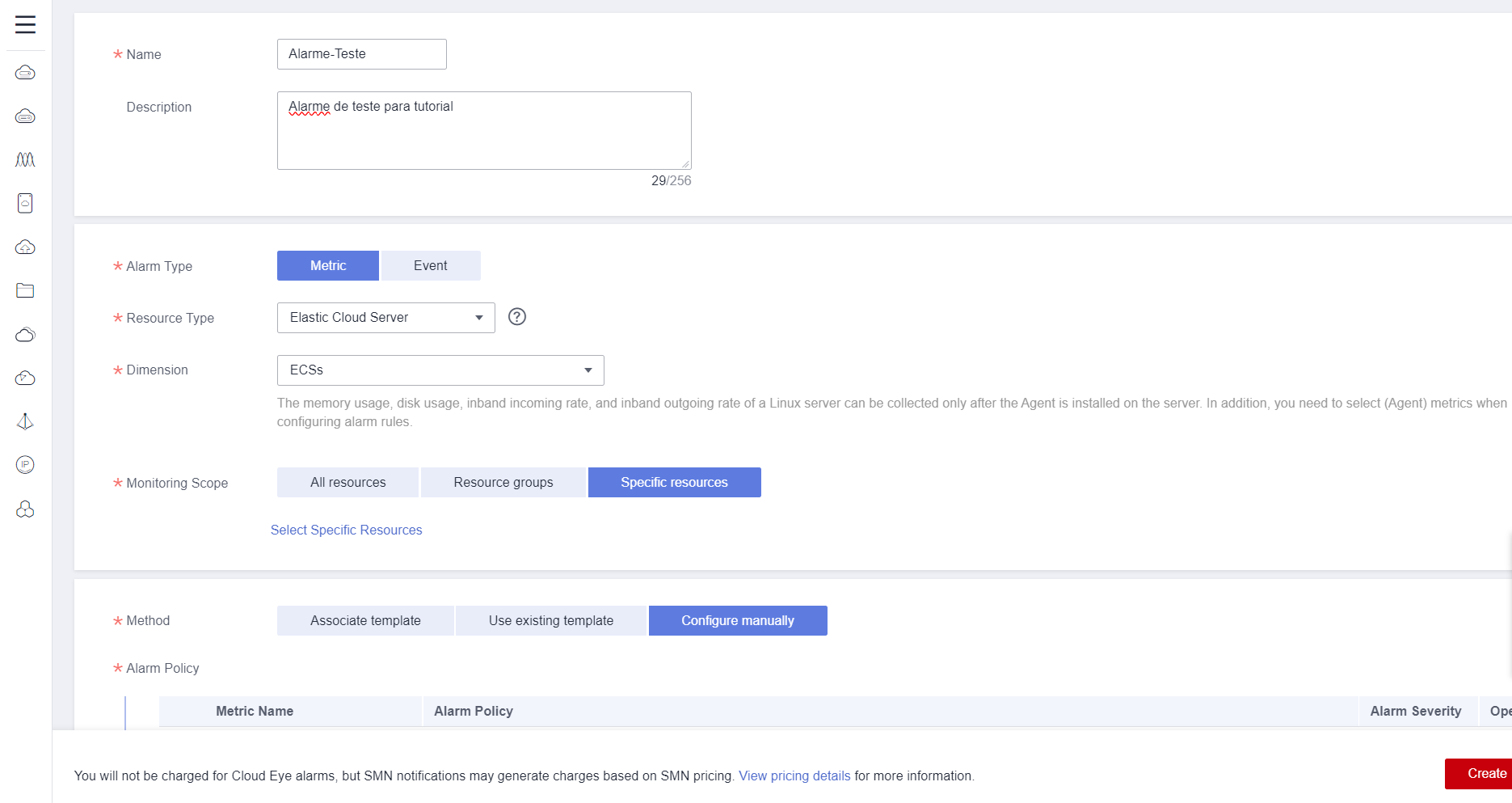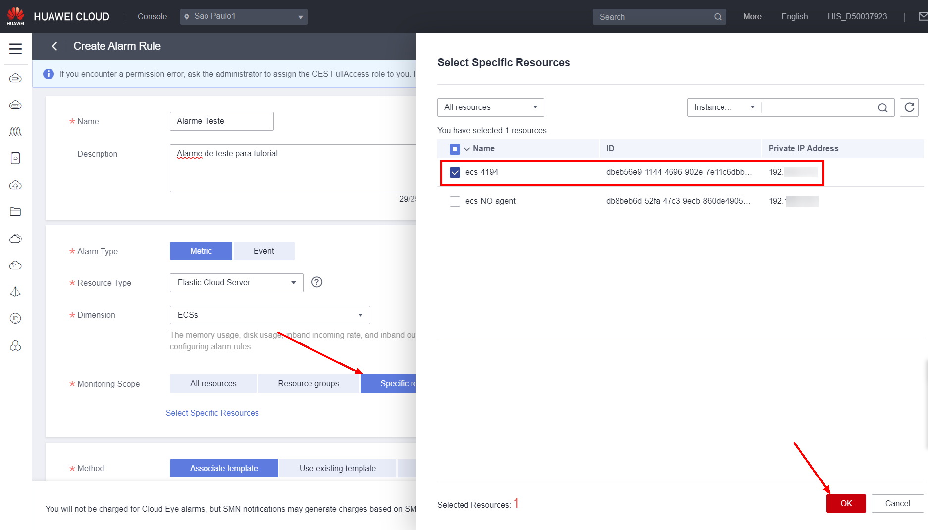 In this example, the ECS “ecs-4194” will be selected as the instance that can trigger the alarm in the Specific resources field under Monitoring Scope.