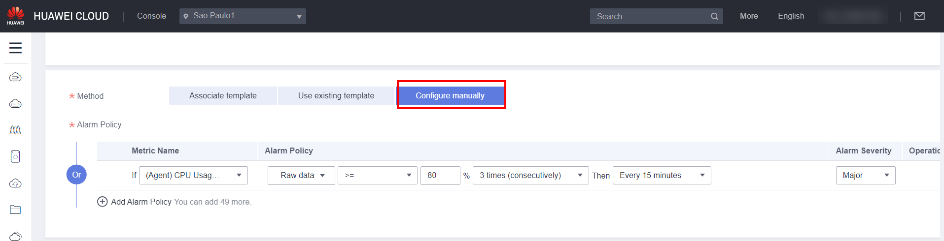 Configure manually: In this option, the metric to trigger the alarm will be configured manually, which allows for greater flexibility.