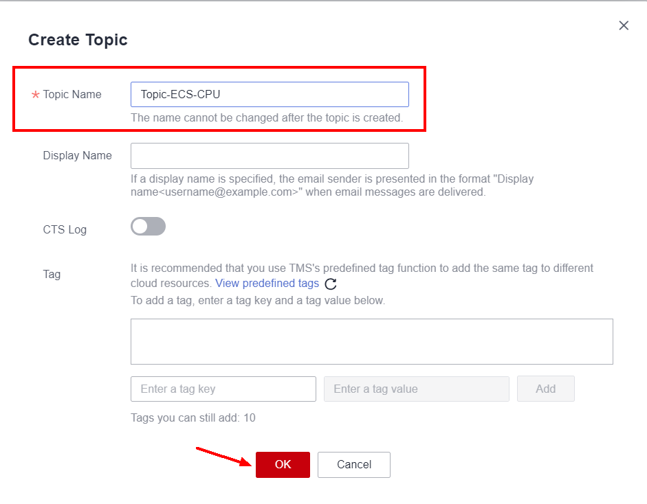 Enter the name of the notification topic in Topic Name and click OK.