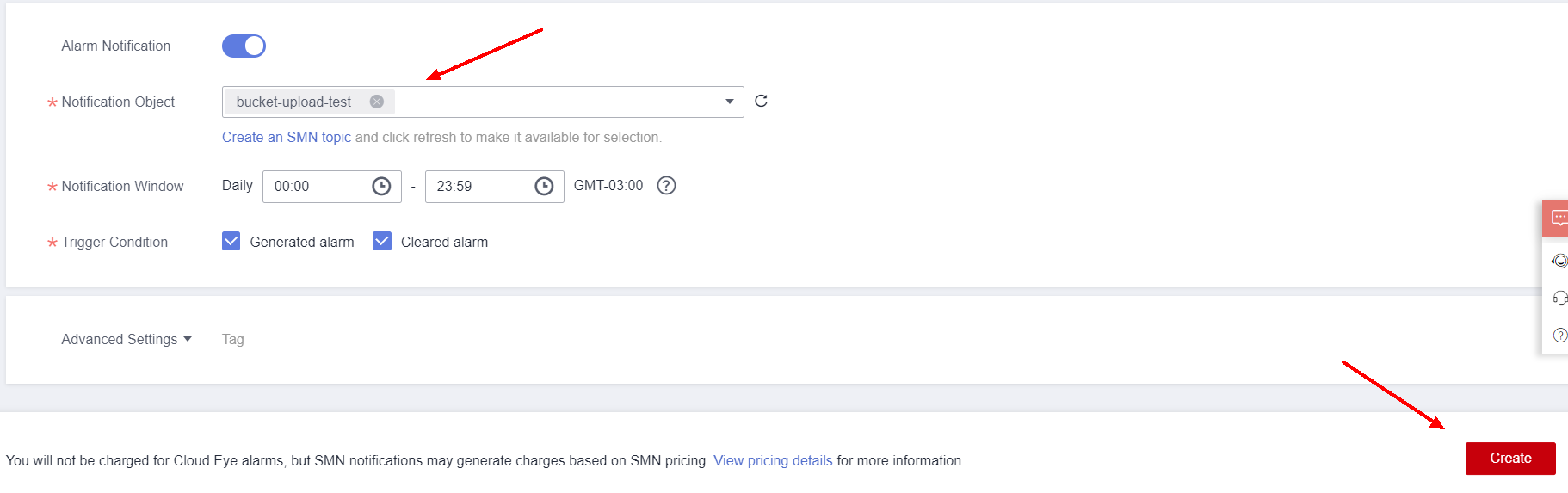 Returning to the alarm creation, select the topic created in the previous steps in Notification Object and configure the time window in which the notification can be sent in Notification Window.