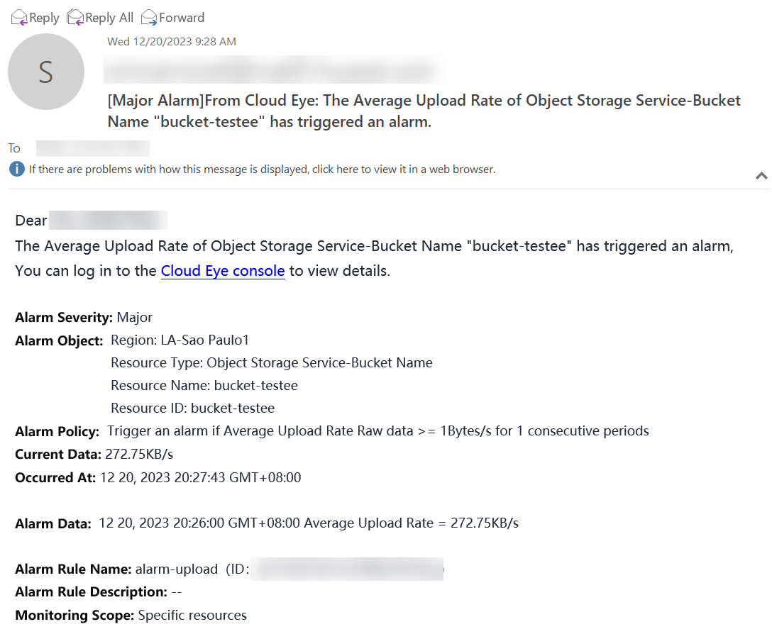 You can also view the notification generated by the alarm on the endpoint selected for sending the notification in the SMN service. In another context, the following email was generated for monitoring a bucket in the OBS service for object storage in Huawei Cloud: