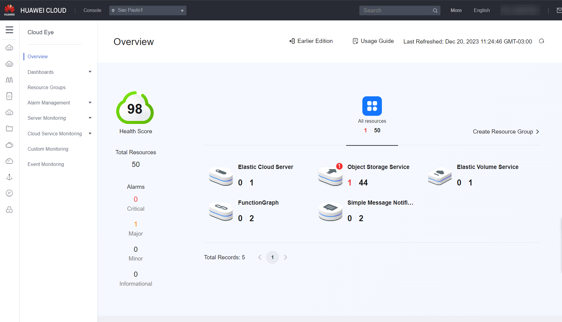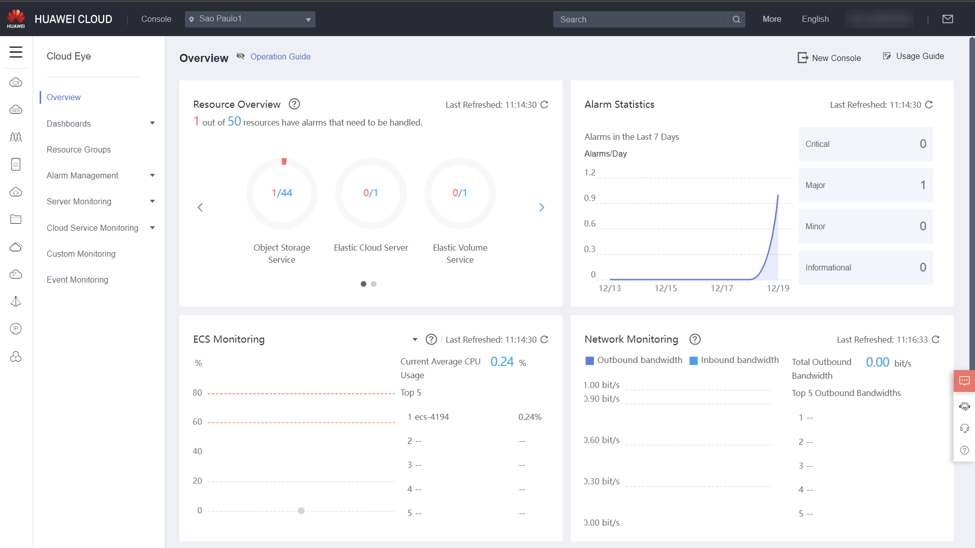 When you open Cloud Eye on the console, the home page that will load is the Overview, where you can see an overview of all resources used in Huawei Cloud, the overall network, CPU, memory, and disk utilization, and which resources have recently triggered alarms and need further attention.
