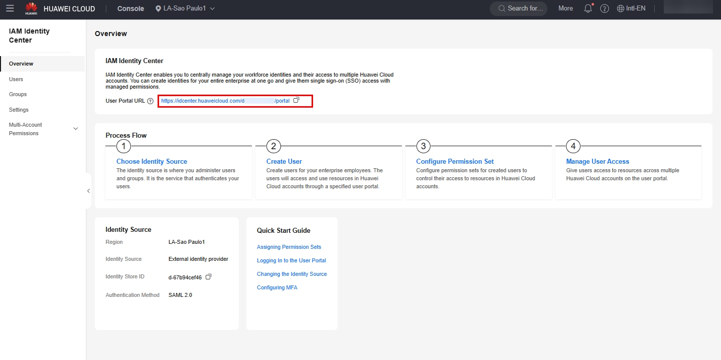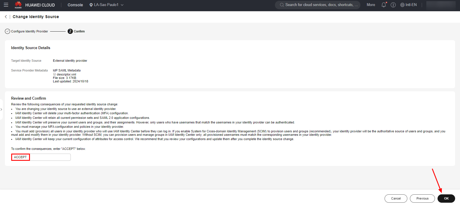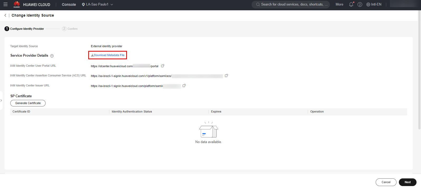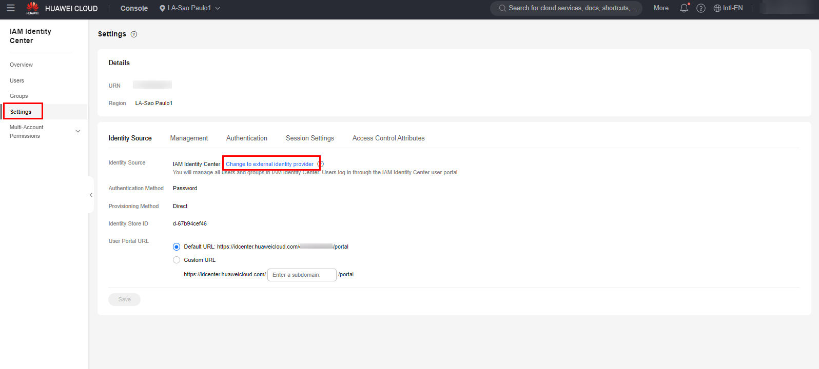 Access the IIC service in the Huawei Cloud console and navigate to the “Settings” section. Click “Change to external identity provider” to create an identity federation configuration.