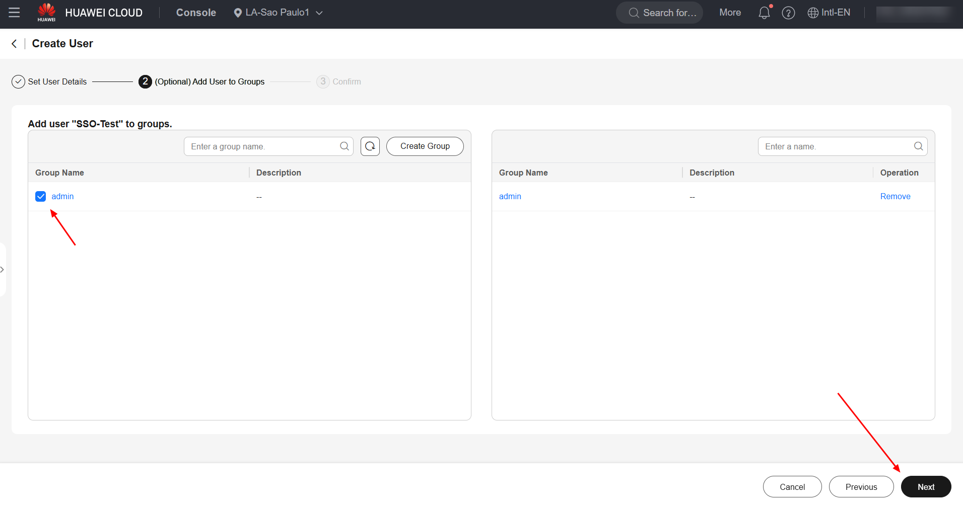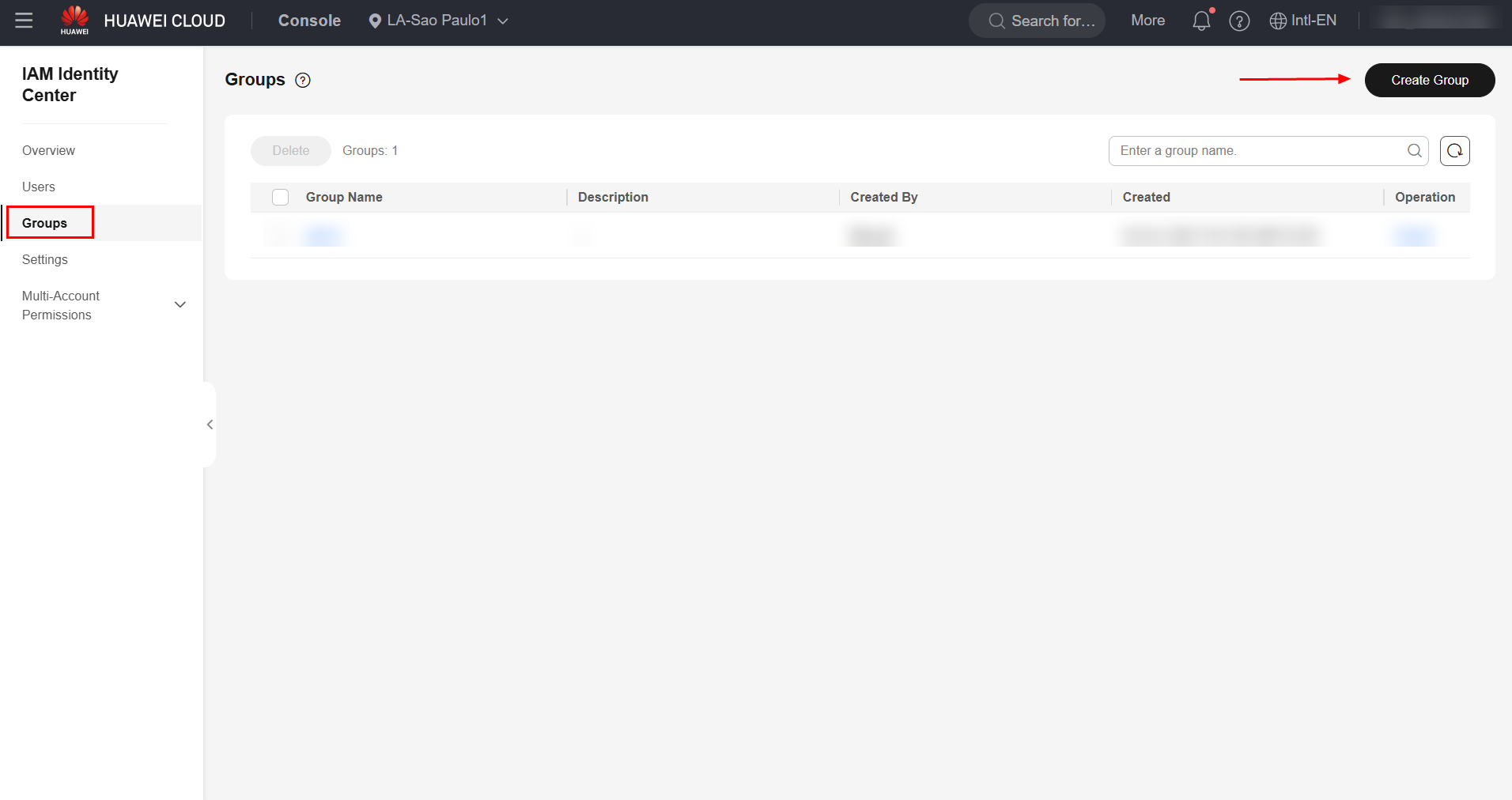 To perform identity federation using an Identity Provider, users and user groups must be created in the Service Provider. To do this, select the “Groups” section and click “Create Group” to create a user group.