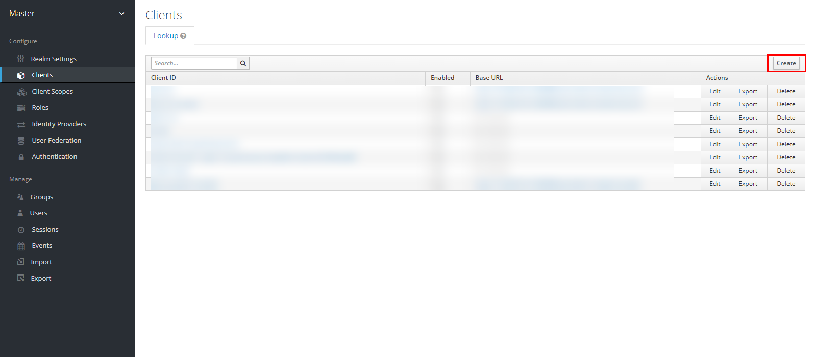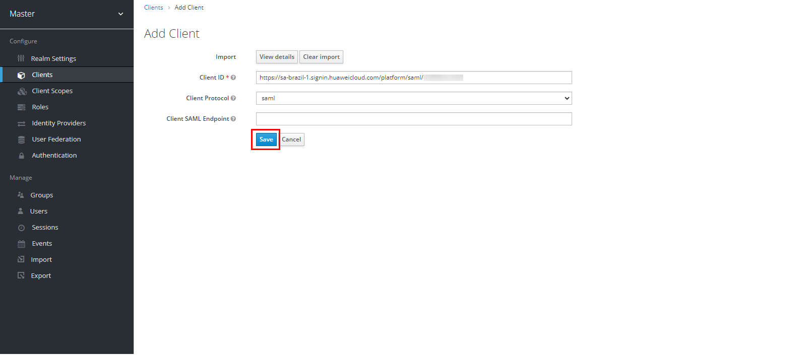 To integrate Huawei Cloud with Keycloak, you must first create a Client in the IdP. To do this, go to the IdP (Keycloak) settings page and navigate to the “Clients” section. Click “Create” to create a new client.