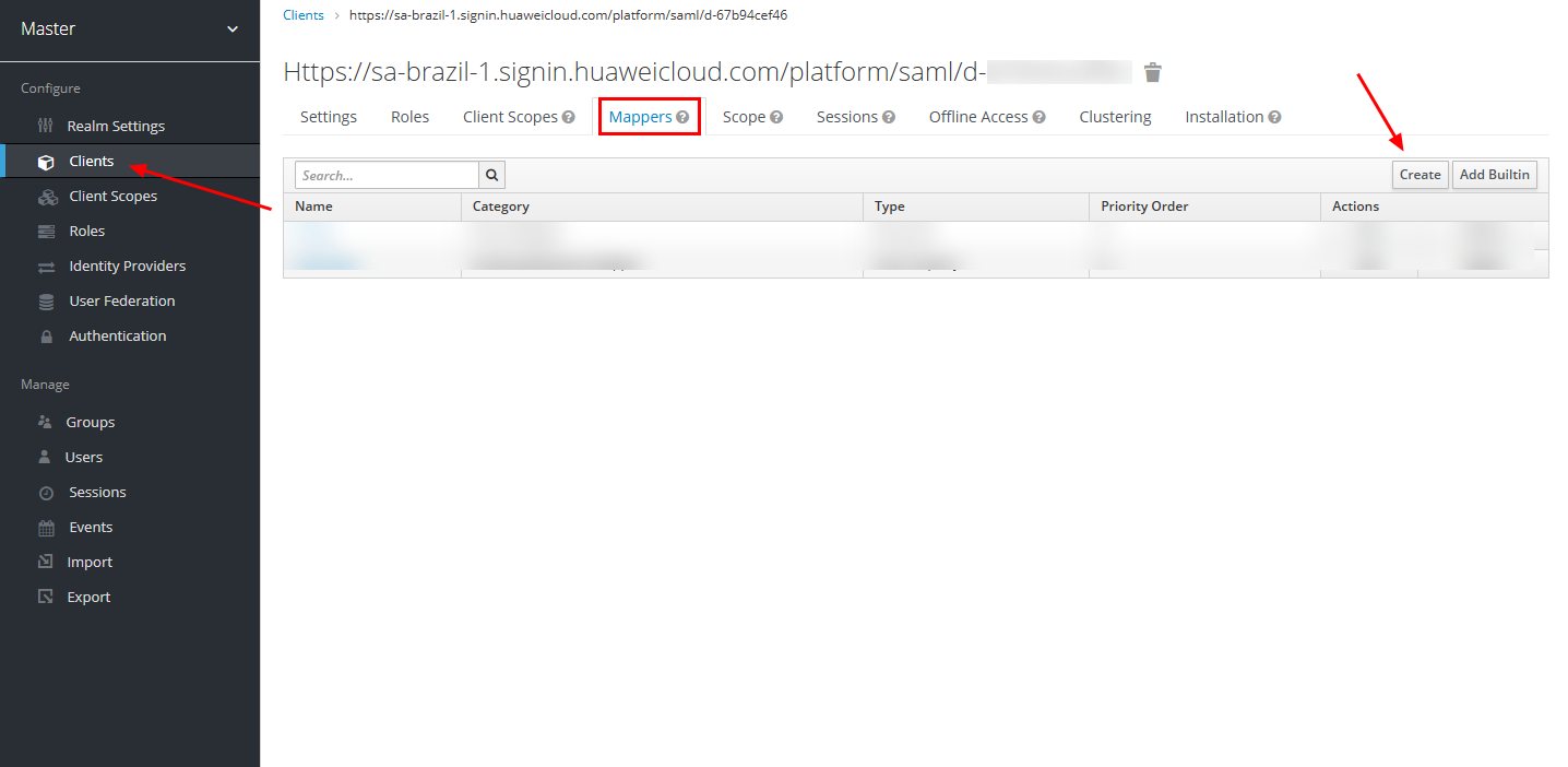 Navigate once again to the “Mappers” section, still in the Huawei Cloud client settings, and click “Create” to create a mapper for the group.