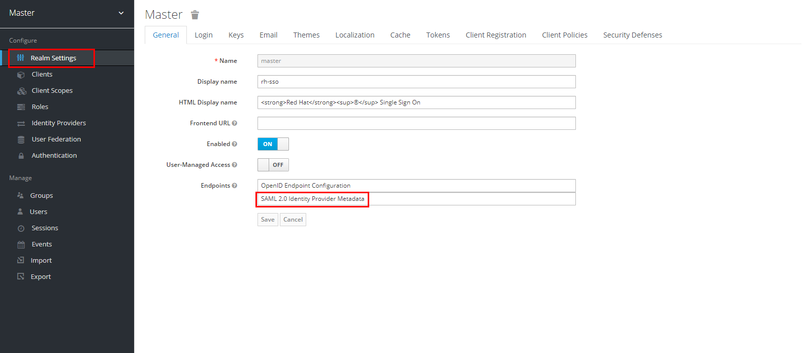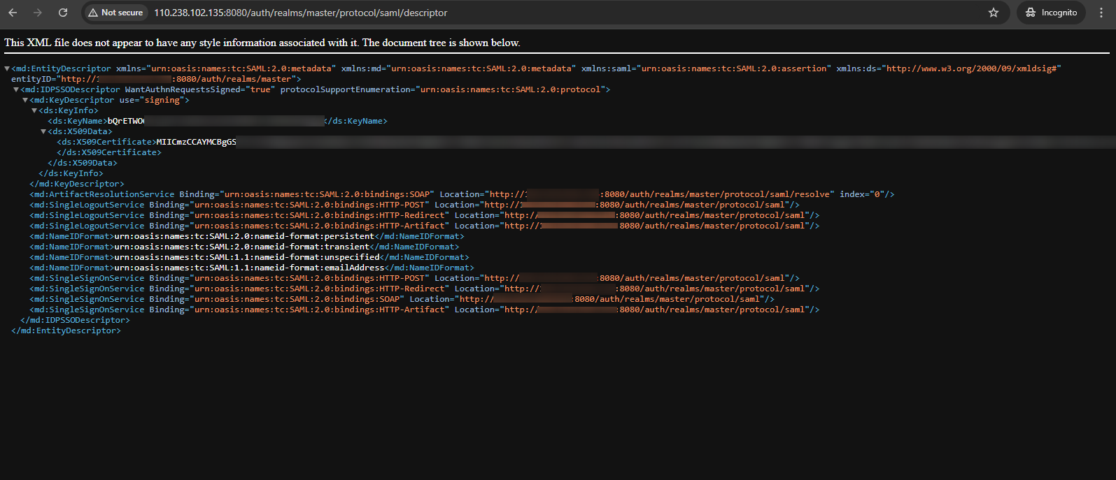 Access the Keycloak portal and navigate to the “Realm Settings” section. Click “SAML 2.0 Identity Provider Metadata” in the “Endpoints” subsection, and save the opened web page locally as an XML file.